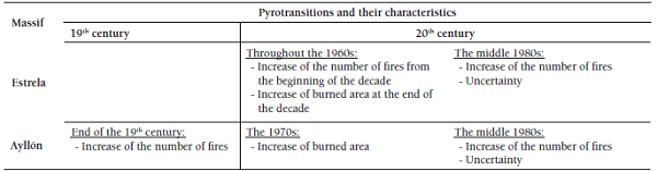 According to these fire regime changes and considering that fire causes are directly related to so- cioeconomic organization and resource management and protection systems (Montiel-Molina, 2013a), three different stages in the fire regime evolution have been identified in the Estrela and Ayllón massifs throughout the nineteenth and twentieth centuries: (a) before the pyrotransition of the end of the nine- teenth century; (b) the first half of the twentieth century, until the second pyrotransition; and (c) the second half of the twentieth century, when another change of fire regime was foreseen in the mid-eighties because of growing uncertainty.