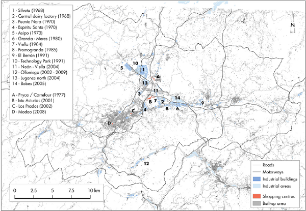 The impact of spatial diffusion of economic activities in the European region has produced extraor- dinary landscape transformations during the last four decades. The disruption of the traditional process of landscape production started in the 1970s. Prior to that period, rural and urban landscapes could be easily delimited. Urban fabric concentrated functions such as residence, commerce, industry and services, whereas rural areas were characterised by the presence of mainly agricultural activities. In the Oviedo region, this process started at the beginning of the 1970s when some state initiatives like a prominent industrial park and a motorway accelerated landscape transformation triggering the relocation of many urban functions in surrounding rural areas.