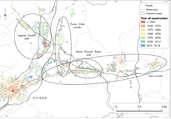 To sum up, during the last decades the landscape of the Oviedo region has experimented a huge and quick transformation mainly due to the construction of new infrastructures and the relocation of economic activities. With the deindustrialization of the mining coal basin and the stagnation of big state companies, a new economic geography model derived from the division of units of production and labour, mainly adopting the form of regional SMEs which seeks flat soil, good connections to infrastructure and flexible plots has emerged. For this purpose, the Siero and Viella Corridor as well as the industrial areas north from Lugones become extremely suitable. As such, with the spatial diffusion of the economic activities— mainly the industrial —the dispersion of new functions to the countryside begins, while former traditional urban functions such as residence or commerce start to move out to the urban fabric and are relocated in the peri-urban area.