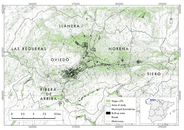 The area studied is placed in the North of Spain (aprox. 43.4º N, 5.8º W) and it covers 598.4 km2. The region was defined by the addition of five municipalities: Oviedo, Siero, Llanera, Noreña, Las Regueras and Ribera de Arriba. This selection is related both with topographical and functional factors. Within the regional limits, a moderate topography basin is located. Oviedo, the capital city of the autonomous region of Asturias concentrated the most of the activities. However, since 1970 an urban diffusion process altered the traditional landscapes that surrounds the city; thus, several functions have been removed from urban fabric and relocated in to rural areas. This shift has produced changes in the land uses. This region is an example of the contemporary transformations that characterize the peri-urban areas and more generally, those located in the rural areas of industrialized countries