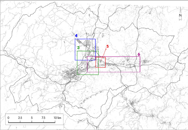 In order to synthesise the whole process, a complete image of the Siero corridor it is provided in Fig- ure 6. The image encompasses all the landscape transformations occurred since 1970s in the pre-littoral depression of the Oviedo region, located eastwards of the capital city of Asturias. This is one of the places exposed to intensive changes in the recent history of the region. Its flat topography and the improve- ments in infrastructures of mobility and transport fostered the consolidation of this mixed economics activities corridor.