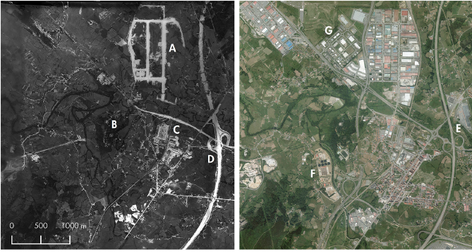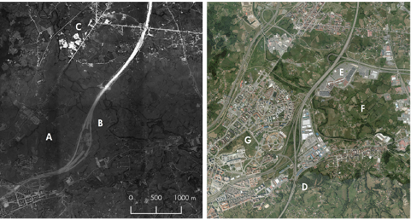 The traditional dispersion of the rural areas in the North of Spain can also be perceived in the photography taken in 1970. Over this traditional spatial pattern, the recent functional dispersion is imposed. The identification of the traditional dispersion of the residential function in rural areas of North Spain was deeply studied by García Fernández (1975) who stated that rural settlements were composed by houses, granaries, farms, stable and other auxiliary buildings related to agricultural practices and plots of lands devoted to crops or pastures. Since the 1970s some changes happened. The addition of new urban developments such as La Corredoria (A), the new Central Hospital of Asturias (G) or the large shopping mall built in the proximity of the junction between the A-66 and A-64 motorways (E) as well as by-pass motorway southwards of Oviedo (D). Furthermore, there are some areas characterized by the abandonment or decease of agricultural activities (F) a clear symptom of the risk of disappearance of rural society (Lizet & Ravignan, 1987).