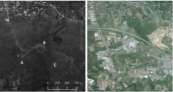 Figure 4 shows landscape transformation occurring in the proximity of Lugones, 5 km to the north- east from Oviedo. This is one of the places were industrialization begins in the region, this location is mainly explained due to the proximity to labour force in Oviedo, the presence of raw materials —kao- linite and clay—, and the good communications with the rest of Asturias. On the left photography, the previous works to construct the industrial park of Silvota can be identified (A), the explosives factory (B) and the steel factory and refractory plant located in the north side of Lugones (C).