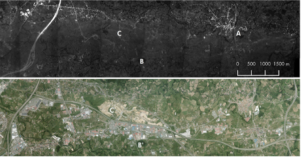 The image (Figure 3) shows transformation in the eastern side of the city of Oviedo (A). When the aerial photo was taken the A-66 motorway, which links the cities of Oviedo, Avilés and Gijón, was under construction (B). It is possible to identify the terrain movements and the lack of asphalt. This is nowadays the most important infrastructure of transport and mobility in Asturias. The town of Lugones (C) locat- ed in the old road between Oviedo and the North of Asturias has experimented a huge transformations process, both in the growth of its urban fabric and in its economic activities as Herrán Alonso (2002) has deeply studied. There are some signs indicative of a low slope terrain, the first one is that River Nora flows over a flat topography therefore creating meanders, the second is the predominance of a straight layout adopted by the road network.
