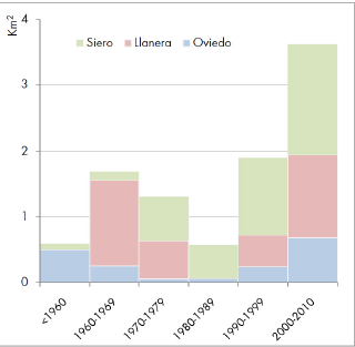 During the 1980s decade, the pace of industrial space production diminished. The collapse of the Francoist regime, the peak of the oil crisis and consequent national economic depression are some of the factors that explain the scarce increase in industrial soil. Although Spain joined the European Union in 1986, the spatial consequences of the allocated regional development funds were not visible until the fol- lowing decades. Moreover, the role of Autonomous Regions and the impulse due to the upward economic cycle experienced in Spain at that time fostered soil production in a way that had not been seen before. In fact, from 2000 to 2010 the amount of industrial soil production was the largest since 1960 in the Oviedo region. Thus, the production of industrial soil is strongly related to successive economic cycles, but also to regional and town planning instruments and the allocation of European funds. Analysing the dataset year by year, three different phases can be distinguished. The first comprises the period from 1968 to 1974, the second phase encompasses the years between 1982 and 1993, and finally, the last stage starts in 2000 until 2010. Even though the dataset does not collect data beyond 2000, the comparison between aerial images taken in 2009 and 2017 shows no growth in industrial soil. Mainly due to the financial crisis, these last years have been characterised by cuts in direct investments at European, national and regional level. Consequently, the slowdown in the economy has slowed both the initiative to produce land as well as the demand for the setting up of new activities.