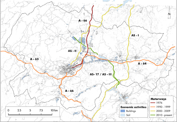 As mentioned before, the improvement in accessibility and the reduction in the time required to travel a distance has had a strong impact on the emergence of a new territorial model characterised by spatial diffusion. Figure 8 illustrates the development of the motorway network in the area of study. In general terms, there are more than a hundred kilometres of motorway in a region of merely 598 km2.