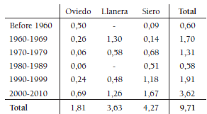 Apart from the changes in the distribution of economic activities, there are some indicators of a huge transformation in both population and mobility. Recent demographic dynamics have been analysed in Obeso Muñiz (2018) showing a population concentration in Oviedo region in the last four decades. In 1970 the region had 210,098 inhabitants making up 20% of the Asturian population, whereas in 2011 its population grew to 300,918 which constitutes 28% of the total population of Asturias. In terms of mobility, the sum of private cars, trucks, motorcycles and buses in Asturias soared up from 22,427 vehicles in 1960 to 637,867 in 2014 according to the Statistical Yearbook of the National Traffic Authority (DGT, 2019). In relation to private car availability, the relation between private-car ownership and population soared up from 0.5% in 1960 to 7% in 1971, and to almost 20% in 1980, whereas in 2014 this percentage reached 46.6%. The increase in car ownership, a good infrastructural network of roads and motorways running through a region with flat topography and lax regulative framework in terms of urban and regional planning are the main factors that explain the shift in the territorial model.