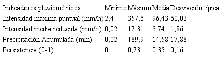 Siguiendo la metodología mencionada, en el presente trabajo se han discriminado 698 episodios de lluvia, a partir de los datos diarios. La selección de episodios es cronológica y, dependiendo de la extensión espacial de los mismos, puede cumplir criterios en una o más zonas al mismo tiempo. Una vez detectado el episodio, se trabaja en todo el ámbito de estudio (CHJ), en el marco temporal del episodio, y con la información cincominutal de cada pluviómetro. Así, en base a los datos cincominutales, se han estimado, para cada evento, indicadores de precipitación acumulada, intensidad máxima puntual y persistencia, en cada punto de observación. Cada episodio ha sido caracterizado con cuatro indicadores básicos que a continuación se definen: