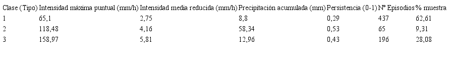 El análisis cluster ha distribuido los episodios en 3 clases que, una vez interpretadas, se pueden calificar como: (1) episodios de alta frecuencia y baja magnitud; (2) episodios de baja frecuencia y gran magnitud y (3) episodios de frecuencia intermedia y gran intensidad. A partir de aquí se ha obtenido un episodio sintético tipo por clase. Para ello, se han seguido los siguientes pasos: (1) agrupar los episodios de cada clase; (2) estimar, para cada una y en cada pluviómetro, los valores representativos de los indicadores (medias de precipitación acumulada y máximos absolutos de intensidad máxima puntual) y (3) elaborar una cartografía sintética de episodios tipo.