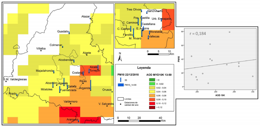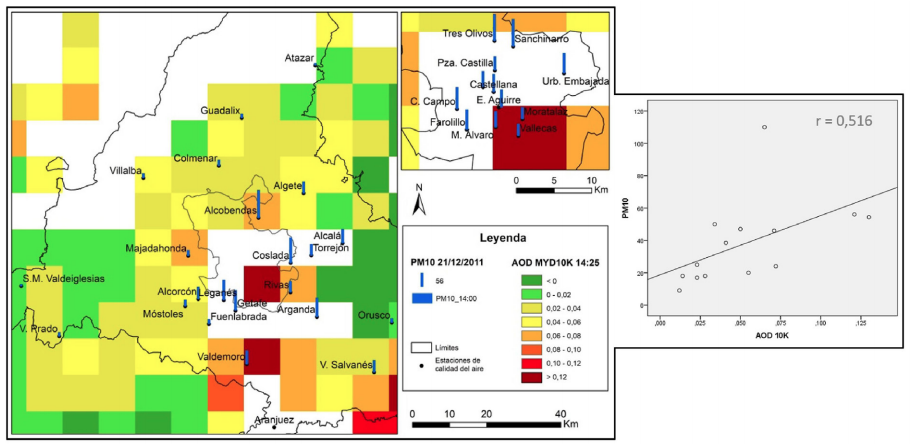 En el mapa del 21 de diciembre de 20119 (véase Figura 8) se aprecian valores más altos de AOD en el centro y sur-sureste de la región. El elevado nivel de material particulado en la capital parece acorde al incremento de AOD sobre el sur de la ciudad de Madrid y su periferia, aun faltando datos del grueso de la urbe. La corrección por humedad relativa y el uso de datos promediados de PM10 por píxel (véase el diagrama de la Figura 8) mejoran algo la correlación, sin alterar apenas la significación. Destaca (en el gráfico sobre todo) el elevado nivel de partículas en superficie registrado en la estación de Alcobendas y otras en el norte de la capital.
