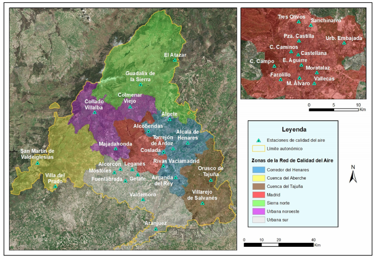 El territorio analizado abarca la Comunidad de Madrid, siendo de especial interés la ciudad de Madrid por su mayor influencia sobre el contenido de material particulado en la atmósfera y la concentración de población.