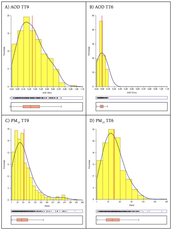 Para comparar los histogramas de ambas variables entre los dos tipos de tiempo se han construido con unos límites inferiores comunes (y también el superior en AOD), aunque con intervalos de desigual amplitud. Todas las variables poseen asimetría positiva, mucho más exagerada en las partículas superficiales (Figura 2, Gráficos C y D) que en el AOD (A y B). Se aprecia también la mayor homogeneidad de los valores en el TT6 que en el TT9, en el cual destaca para AOD una larga cola a la derecha.