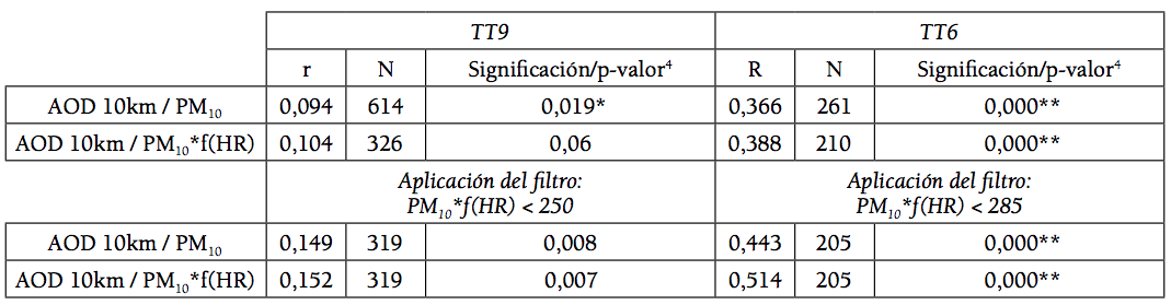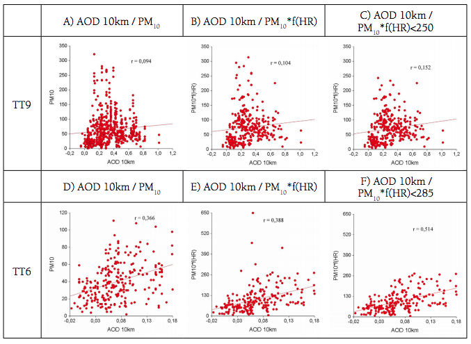 En resumen, del análisis para días con TT6 se constata una cierta disparidad en la disponibilidad de datos (más abundantes en el satélite Aqua) y que también surgen unas pocas correlaciones positivas entre MODIS AOD y PM10, que serían significativas y acordes con la hipótesis planteada, sin que hayan aparecido coeficientes relevantes que la contradigan.
