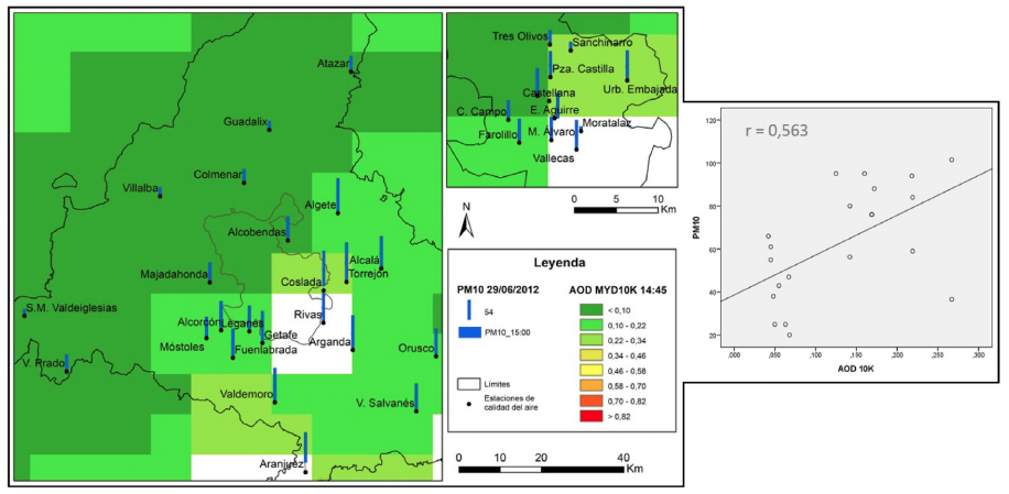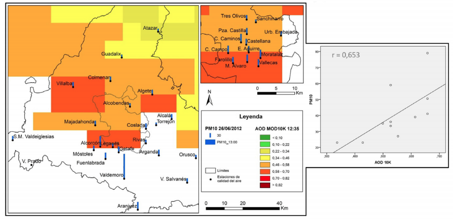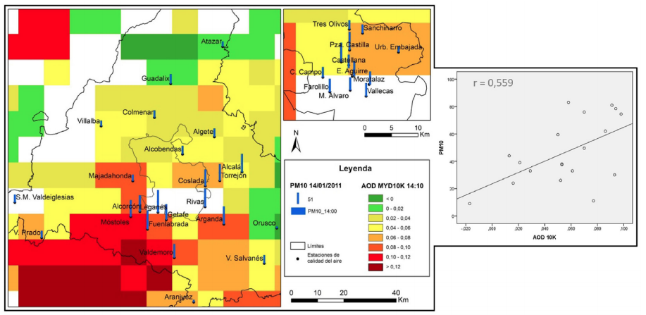 Entre los primeros estudios que correlacionan AOD del sensor MODIS con los aerosoles presentes en la superficie terrestre existen dos de especial mención: Wang y Christopher (2003) obtuvieron correlaciones de 0,7 al comparar AOD con mediciones horarias de PM2,5 de siete estaciones en el Condado de Jefferson (Alabama, EEUU), mientras que Chu et al. (2003) hallaron correlaciones de hasta 0,82 en el norte de Italia utilizando PM10 diario superficial como parámetro. Aun siendo notables las diferencias metodológicas entre ambos estudios debido a los parámetros y escalas utilizados, y que las condiciones de la localización en el último caso eran ideales —las masas de aire eran estables y las fuentes de contaminación fijas—, ambos trabajos mostraron el gran potencial de aplicación de sensores remotos para la monitorización de la contaminación atmosférica.