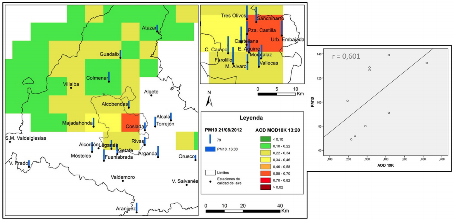Aunque la mayor parte del territorio carezca de datos de AOD, con la información de las zonas Urbana noroeste, Sierra norte y de la ciudad de Madrid (véase mapa de la Figura 6) emerge una correlación positiva el día 21 de agosto de 2012. La relación se intensifica con los datos de PM10 promediados por píxeles (r=0,601, pero con n=9, que resultaría en una menor significación), y también al incluir la corrección por humedad, aunque ahora ya no sería estadísticamente significativa. En el recuadro de la ciudad de Madrid de la Figura 6 se patentiza el claro impacto de la misma sobre el elevado valor de AOD y también se vislumbran las implicaciones notables de la geometría (y resolución) de los píxeles sobre los datos de MODIS y su relación con las PM10, pues muchas estaciones terrestres próximas al píxel con alto AOD tienen elevados niveles de material particulado, y sin embargo se ubican en píxeles cercanos con menor AOD7.