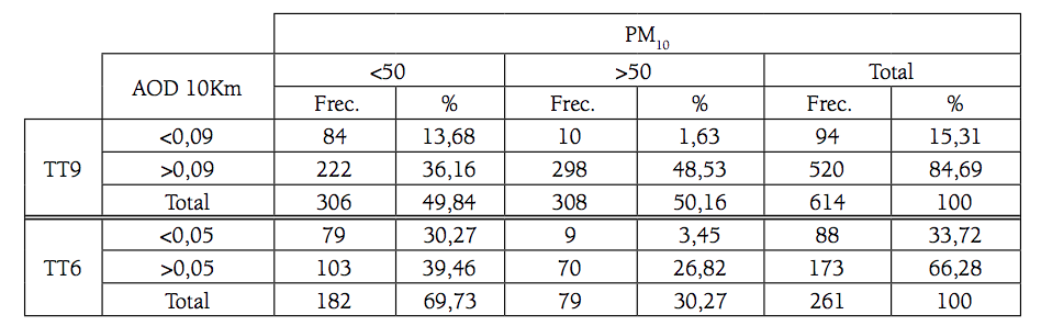 A partir de tales observaciones se planteó acometer análisis agrupando los datos y generando tablas de contingencia. La variable AOD se ha dividido en dos intervalos, usando como límites los umbrales recién mencionados. Las PM10, por su parte, se han dividido mediante el límite diario permitido por la legislación, 50 µg/m3. El resultado se muestra en la Tabla 3.