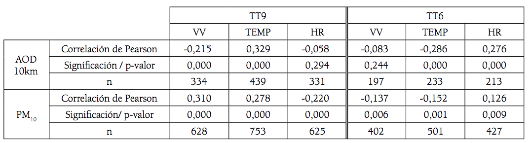Los resultados obtenidos en este trabajo al desagregar por tipos de tiempo tienen cierta concordancia con los de otros estudios que segmentan sus datos por estaciones del año. Gupta y Christopher (2009) obtienen correlaciones más altas en otoño y primavera, y más bajas en verano e invierno, al igual que Ghotbi, Sotoudeheian y Arhami (2016), aunque este último obteniendo correlaciones más bajas en verano. Ambos sostienen la existencia de diferencias bien definidas entre estaciones, remarcando el peor desempeño de las estaciones de verano e invierno. A ello se suma que en períodos de elevadas concentraciones de PM10 la relación con el AOD se deteriora, según Ghotbi et al. (2016). En este caso la correlación global entre PM10 y AOD (Tabla 2) se mostraba superior en el TT6 (invierno), aunque al segmentar los datos (por días y satélites) han aflorado relaciones positivas de cierta intensidad en ambos tipos de tiempo, si bien con muestras pequeñas.