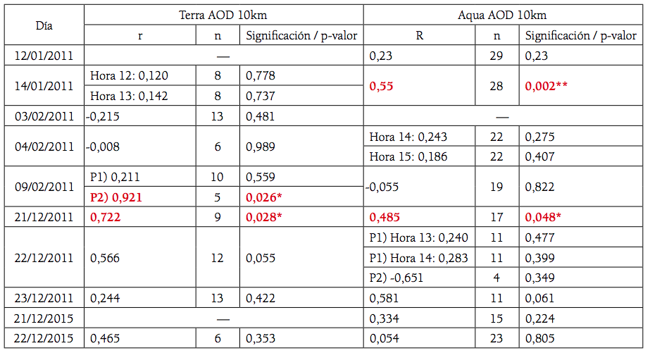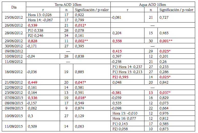En la Tabla 5 se presenta una panorámica de las relaciones bivariadas (con n ≥ 9) en el TT9 entre AOD y PM10, para luego profundizar en algunos casos reveladores. Se aprecia que las correlaciones de Terra AOD son mayormente positivas, pero sólo cuatro serían significativas. La mejor correlación corresponde al día 29 de junio de 2012 con una r de 0,828 y una p de 0,002, seguido del 26 de junio del mismo año con una r de 0,539 y una p de 0,012. En el resto de los días las correlaciones son próximas a cero (a veces negativas) y no serían significativas.