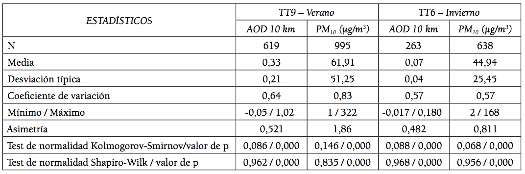 En la Tabla 1 con los resúmenes de los datos se aprecia que hay más disponibilidad de datos de alta contaminación en la muestra de tipo de tiempo anticiclónico de verano (TT9) que la de tiempo anticiclónico de invierno (TT6). Ello no repercutirá en los resultados, pues se analizarán separadamente. Las medias exhiben unos valores, tanto en AOD 10 km, como PM10, claramente superiores en el TT9 respecto al TT6, como consecuencia de que en verano son muy frecuentes las intrusiones de aire sahariano provocadoras de niveles elevados de inmisión de partículas, cuya concentración supera el límite diario permitido por la legislación (50 µg/m3).