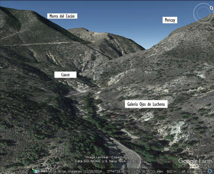 El sistema de Ojos de Luchena se localiza en el cauce de este río, aguas abajo del embalse de Valdeinfierno. En este punto, el río ha creado un cañón que taja la sierra de Pericay de NO a SE, cuyo punto más elevado alcanza los 1.386 metros de altitud en la Morra del Cocón al SO, y 1.235 metros en la pared NE, en la cima de Pericay. Sin embargo, el concepto río puede aplicarse en la actualidad una vez llegados al manantial, ya que anteriormente el cauce permanece completamente seco (Figura 9).