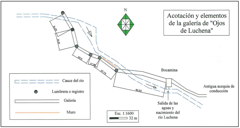 Como puede observarse, se trata de una de las galerías drenantes de mayor caudal, no solo en el territorio de estudio, sino en todo el sureste de España. Además, los caudales de este aprovechamiento han sido comparados a través de la influencia que pudiera existir por la construcción posterior, unos 3 kilómetros aguas arriba, del embalse de Valdeinfierno. Sin embargo, la galería no ha mostrado signos de haber sufrido variaciones por este motivo a lo largo de estos últimos siglos. Rodríguez (1995, p. 78) destaca que “el agua superficial almacenada en el pantano (...) y la que sale por la fuente sería aproximadamente la misma que la superficial que se infiltraba (...) entre la fuente y el pantano”. Por su parte, García y Pelegrín (2002) resaltan que “los datos históricos del caudal de Ojos de Luchena (...) comparándolos con los valores registrados hoy en el manantial, no parecen inferiores aquellos, de épocas pasadas, a los que se registran hoy en la actualidad” (p. 10).