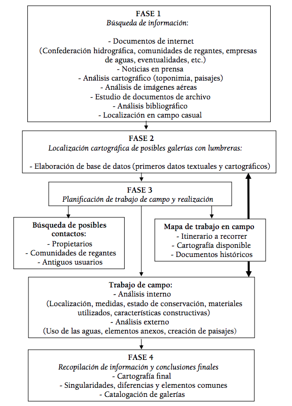 Esta se estructura en torno a la planificación y realización del trabajo de campo, con la visita a los sistemas drenantes y la concertación de entrevistas con expertos y conocedores del territorio. En esta fase también se comprueban las situaciones descritas en documentos históricos y se comparan con el estado actual de las diferentes captaciones. Se analizan las características constructivas de las galerías, su estado de conservación y funcionalidad, así como su papel en la configuración de paisajes locales y su valor patrimonial, a través del estudio de otros posibles elementos anexos, que permiten diversificar el uso del agua, diferente al regadío. La fase final se corresponde con el análisis global de los sistemas encontrados y su influencia en el territorio, se catalogan en base a sus características y se elabora una cartografía final.
