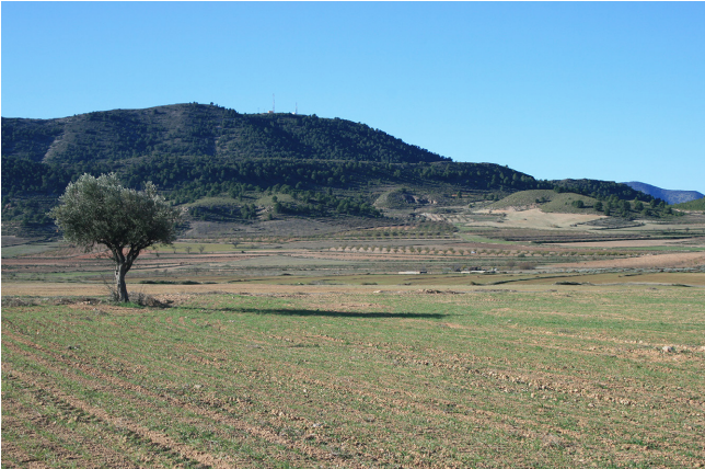 El paisaje típico que ofrece este espacio es el secano mediterráneo, donde se entremezclan los cultivos de cereal, vid, almendros y olivos, regados algunos de ellos con aguas de pozos profundos (Figura 3). Estos cultivos se localizan en cañadas y planicies coluviales, lugares más apropiados para la agricultura y donde existe una mayor disponibilidad de recursos hídricos subterráneos. Junto a ello, también se pueden encontrar ejemplos de cultivo en terrazas a orillas de ramblas y fondos de valle. Alrededor de los núcleos de población, se conservan pequeñas huertas, que han servido históricamente para el abastecimiento de la población local, regadas secularmente con el agua de fuentes y manantiales, como ocurre en Coy y Doña Inés. Los relieves circundantes, por su parte, muestran grandes extensiones de eriales y pinares, estos últimos fruto de repoblaciones en épocas pasadas.