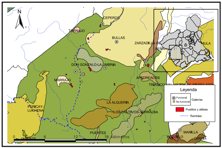 En función de la localización de estos sistemas y la información hidrogeológica disponible (IGME) (Figura 6), podemos comprobar que los sistemas que mayores caudales han presentado, y presentan, se han construido en zonas de contacto entre materiales permeables e impermeables. Así, Ojos de Luchena constituye la salida natural del acuífero Pericay-Luchena. Por su parte, las galerías de Zarzadilla de Totana y Avilés parecen ser los puntos de salida del acuífero de Zarzadilla; el primero en la cara sur de la sierra de Burete; el segundo, en la cara norte de este relieve bajo la rambla del Cargador. No obstante, en este último caso no estamos seguros de que se trate de un sistema de captación de las aguas del acuífero, sino más bien de filtración de las corrientes subálveas de esta pequeña red hidrográfica.