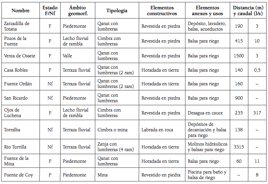 En cuanto a la localización, cinco de estos sistemas se construyeron en piedemontes o glacis, cuatro aprovechando los subálveos de lechos y terrazas fluviales y dos ocuparon espacios de valle, con la finalidad de captar aguas subálveas. Respecto a la tipología de estos sistemas, seis podemos considerarlos como ejemplos de galerías con lumbreras o galerías drenantes, otros dos son cimbras o galerías de filtración de agua, situadas bajo lechos fluviales (Pozos de la Fuente y Ojos de Luchena) y una constituye un sistema de zanjas o minados con lumbreras, fundamentalmente de conducción como es el complejo del margen izquierdo del río Turrilla. La fuente de Coy, por su parte, constituye un aprovechamiento del tipo zanja sin lumbreras, recogiendo las aguas entre dos capas geológicas.