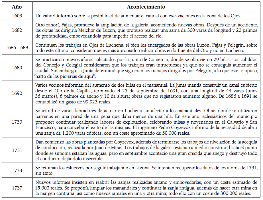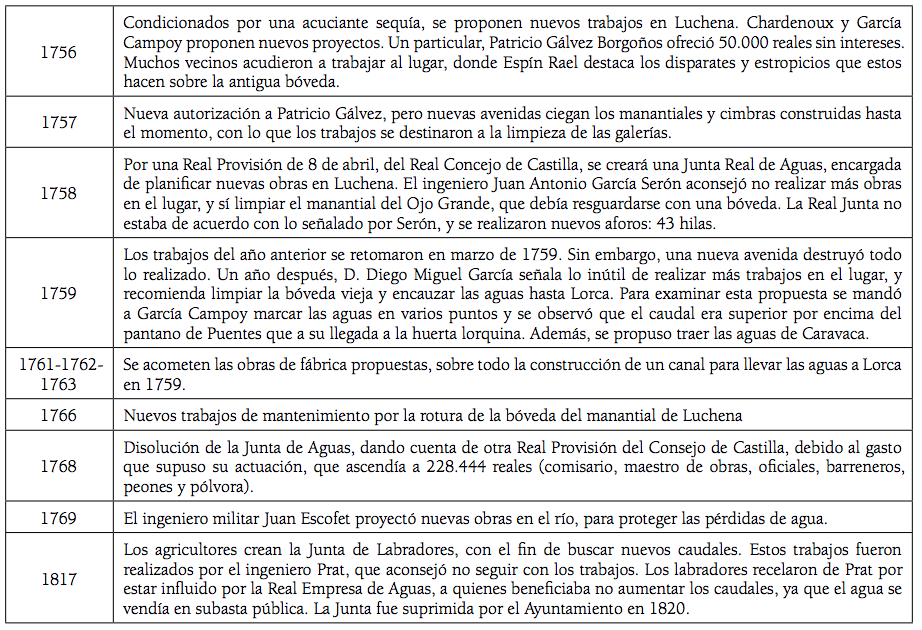 El proceso de construcción y búsqueda de agua en este punto del territorio lorquino puede comprobarse por medio de los datos recogidos por Joaquín Espín Rael, historiador y cronista de la ciudad en la primera mitad del siglo XX. Estos acontecimientos históricos se presentan en formato tabla, donde se muestran los sucesivos intentos de los regantes por aumentar los caudales desde comienzos del siglo XVII (Tabla 2).