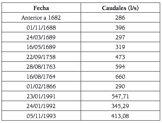 La información histórica de este aprovechamiento, cuyo fondo documental se denomina “Sindicato de Riegos” en el Archivo Municipal de Lorca, también permite comprobar el aforo registrado por este manantial desde finales del siglo XVII (Tabla 3). Estos datos, difundidos por Espín Rael a principios de siglo XX y que han sido posteriormente recogidos por otros investigadores (Rodríguez, 1995; García y Pelegrín, 2002), además, ha posibilitado analizar la influencia de la presa de Valdeinfierno sobre el manantial situado aguas abajo, ya que ésta empezó a construirse en 1785 pero no funcionó hasta 1897, mucho tiempo después de estar en explotación la galería de los Ojos de Luchena que, como hemos visto, hay constancia de afloramientos a finales de la centuria del seiscientos.