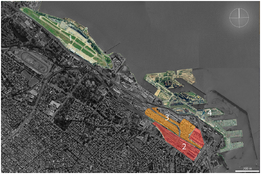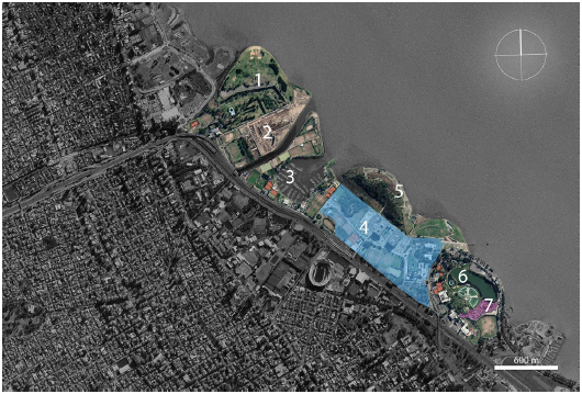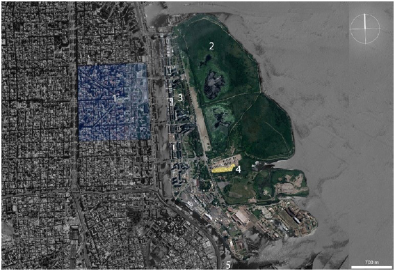 Fuente: Modificado de Google Earth (Noviembre 2018)En ese entonces, los rellenos sumaban 1.051 hectáreas, incluyendo unas 254 hectáreas incorporadas gracias a la protección del malecón del ferrocarril (CPAU, 2019). La ribera de la ciudad abarcaba apenas la mitad de la longitud actual (Figura 1); estaba limitada al norte por el Parque Tres de Febrero y al sur por las viviendas de los trabajadores asentadas en las áreas bajas de la Boca del Riachuelo (Arrese, 2002) (Figura 6). A partir de este último sector, que incluía al área central, la expansión urbana hacia el río y hacia el norte fue resultado de distintas visiones sobre las formas de aprovechamiento y ocupación del espacio costero, que llevaron a la construcción de estructuras portuarias, redes de transporte, redes de servicios y equipamiento urbano, así como para creación de espacios verdes, áreas recreativas y, en menor medida, áreas residenciales.