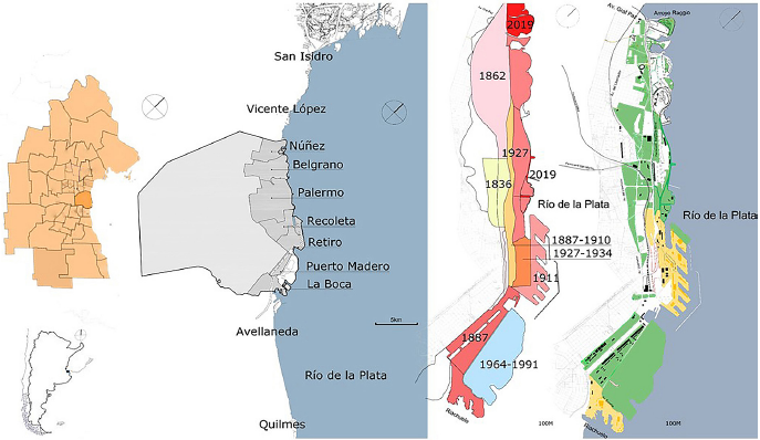 Referencias (de izquierda a derecha): República Argentina (abajo) y Región Metropolitana de Buenos Aires (arriba); Ciudad Autónoma de Buenos Aires, comunas de la ciudad lindantes al río de la Plata y municipios vecinos; Secuencia histórica de los rellenos costeros; Frente urbano costero, indicando sectores portuarios (amarillo) y áreas verdes (verde)