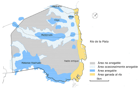 Numerosas intervenciones en la línea de costa modificaron la geometría hidráulica de los cursos fluviales, variando su longitud y perfil longitudinal y disminuyendo aún más la escasa pendiente. Las tormentas del SE (sudestadas) suelen agravar la situación, ya que pueden elevar el nivel del río de la Plata hasta 4 m (Pereyra, 2004), impidiendo la evacuación del exceso de caudal aportado por las precipitaciones locales. El control de inundaciones ha requerido numerosas obras de infraestructura que continúan en la actualidad.