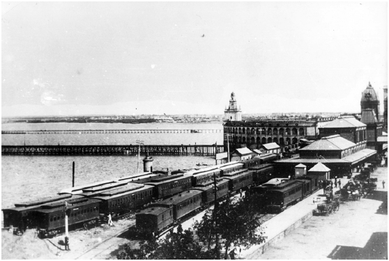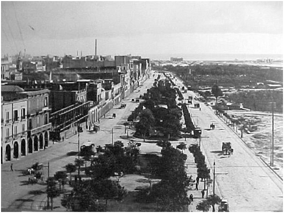 La costa actual comenzó a configurarse hacia 1780, cuando una tormenta cegó el brazo del Riachuelo que se usaba para desembarcos (hoy desaparecido) y reorientó el cauce hacia la desembocadura actual, que marca el límite sur de la ciudad (Figura 6). El primer edificio público de gran volumen fue la Aduana Nueva (1857), diseñada por Edward Taylor, de estilo neoclásico y con espigón de madera de 210 metros (Figura 3). En 1864 comenzó el tendido de líneas férreas que convergían en la Estación Central, que funcionó hasta 1897, cuando se incendió. El Ferrocarril del Sud llegaba al puerto Ensenada mediante un viaducto de columnas metálicas elevado sobre el río, mientras el Ferrocarril del Norte atravesaba el Paseo de Julio (actual Avenida Leandro N. Alem) (Figura 4), llegaba hasta San Fernando y además empalmaba con el Ferrocarril del Oeste (Segura, 2002).