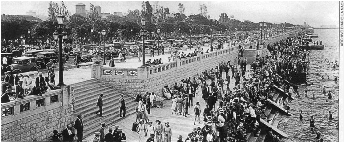 El frente urbano costero de Buenos Aires es resultado de operaciones de muy diversa índole sin continuidad en el tiempo, carentes de una visión consensuada capaz de establecer objetivos en el mediano plazo y, con frecuencia, contrapuestas entre sí. La imagen de diferentes sectores sociales compartiendo el espacio en los balnearios del Centenario, que servían de marco a la sociabilidad de las clases adineradas y proporcionaban solaz a las clases trabajadoras, contrasta con la costanera del último período dictatorial (1976-1982), en estado de abandono y con prohibición de acceso al río.