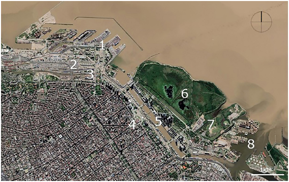 Referencias: 1) Casco histórico; 2) Reserva Costanera Sur; 3) Puerto Madero; 4) Barrio (ex asentamiento) Rodrigo Bueno; 5) Desembocadura del Riachuelo