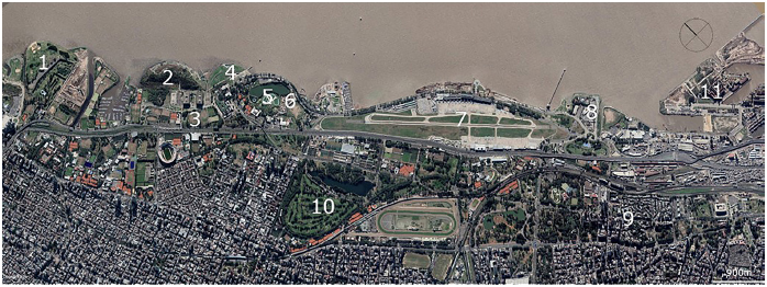 Referencias: 1) Parque de los Niños; 2) Reserva Ecológica Ciudad Universitaria; 3) Ciudad Universitaria; 4) Parque de la Memoria; 5) Parque Norte; 6) Parque Temático Tierra Santa; 7) Aeroparque Metropolitano; 8) Costa Salguero; 9) Palermo Chico; 10) Parque Tres de Febrero.