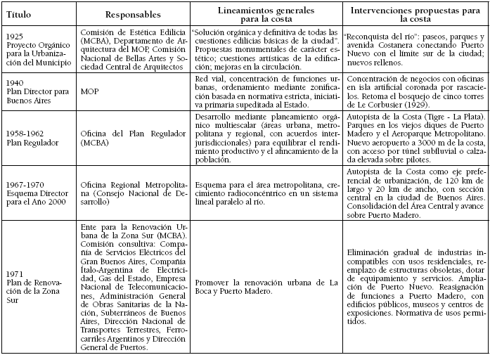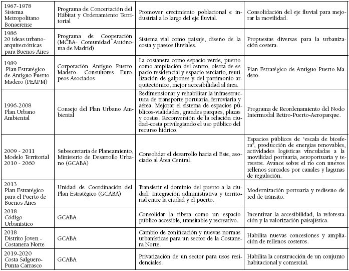 El tratamiento de la costa como ámbito diferenciado y su relación con el resto del área urbana puede rastrearse en los sucesivos planes para Buenos Aires (Tabla 1). El Proyecto Orgánico para la Urbanización del Municipio (Comisión de Estética Edilicia, 1925), entre los aportes originales para la época, planteaba el completamiento de la Costanera Sur y el diseño de una red de espacios verdes en Costanera Norte (CPAU, 2011). Paseos y conjuntos residenciales de baja densidad sobre los nuevos rellenos, incluida la ampliación de la Plaza de Mayo, serían los hitos de la “reconquista del río” por parte de la ciudad, conciliando “la obra de arte con la obra natural”, concepción que permanecería vigente por casi tres décadas (Mártire, 2008; Novick, 2001, 2012).