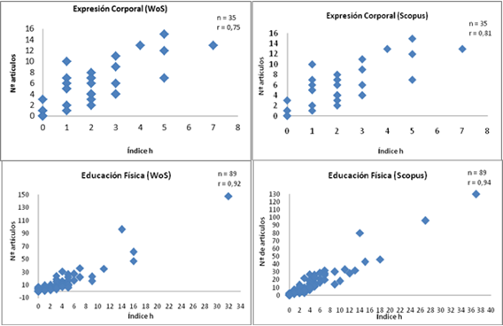 En nuestro trabajo también se constata la relación existente entre la cantidad de artículos y el Índice h. En este trabajo, hemos tratado de examinar la potencia del Índice h como un indicador de la calidad de la producción, los datos indican que la mayor productividad de un investigador va ligada a la calidad de la investigación, las correlaciones muestran que este hecho ocurre tanto en WoS como en Scopus. El Índice h es ante todo un indicador a emplear para valorar la trayectoria científica de un investigador, midiendo su regularidad en cuanto a su productividad e impacto científicos, asimismo, puede emplearse para medir el rendimiento de las revistas e instituciones (Cabezas-Clavijo & Delgado-López-Cózar, 2013). Su enorme facilidad de cálculo y uso, y su robustez y tolerancia a las desviaciones estadísticas, le hacen un indicador interesantísimo (Cabezas-Clavijo & Delgado-López-Cózar, 2013). Ahora bien, como afirman diferentes autores (Bar-Ilan, Levene & Lin, 2010; Meho & Yang, 2007) es necesario, para evitar sesgos, medir el rendimiento de un investigador o institución con diferentes bases de datos; nuestro estudio contribuye a poder analizar un campo poco estudiado bibliométricamente y por consiguiente a que las valoraciones a profesores e instituciones sean más rigurosas y justas.