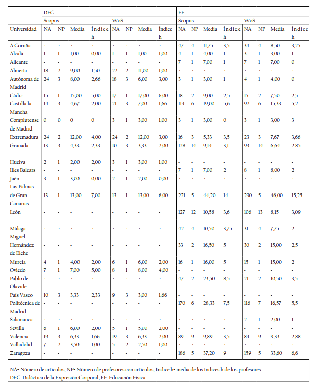 En cuanto a la producción por universidad se observan resultados diferentes en las áreas de conocimiento analizadas. Así, por ejemplo, la Universidad de Canarias ocupa el primer puesto en EF y el segundo en DEC. En cambio, la Universidad de Cádiz, ocupa el primer puesto en DEC y el catorce en EF. Estos resultados coinciden básicamente con los publicados por Rankings I-UGR de Universidades Españolas según Campos y Disciplinas Científicas (3.ª Ed., 2012), exceptuando la Universidad Europea de Madrid que al ser privada los autores del ranking no la tuvieron en cuenta. Los resultados entre Scopus y WoS coinciden en identificar a las universidades más productivas, las únicas diferencias son de escala y tamaño.