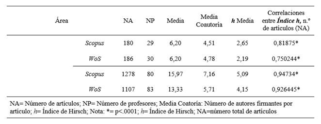 Se analizó un total de 124 profesores, de los cuales 35 corresponden al área de DEC y 89 al área de EF. En la base de datos de WoS, de los 35 profesores del área de DEC, 30 tenían artículos en la base de datos WoS (85,71 %) y de los 89 profesores del área de EF, 83 tenían artículos en la base de datos WoS (93,25 %). En la base de datos Scopus, un total de 29 profesores de DEC tenían artículos, es decir un 82,85 %, mientras que en el área de EF un total de 80 profesores tenían como mínimo un artículo en dicha base, lo que supone un 89,88 %.