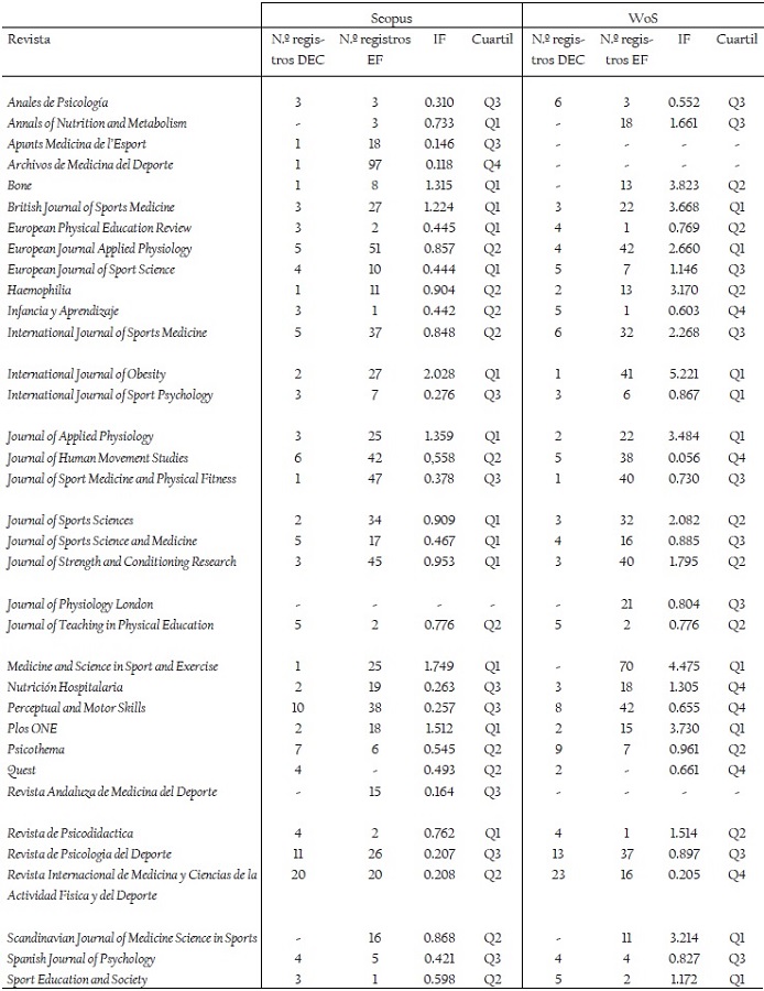 Este es el primer estudio, del que se tenga conocimiento, que analiza las producciones científicas en las áreas de EF y DEC en WoS y Scopus en profesores funcionarios con sexenio en España. El presente trabajo pone de manifiesto que existen importantes diferencias en la producción de los profesores del área de EF y DEC en artículos de revistas con factor de impacto tanto en WoS como en Scopus. En nuestro artículo se ha podido comprobar que en general los profesores publican más trabajos en Scopus que en WoS. También se ha podido observar que los trabajos en Scopus son más citados que en WoS; este hecho queda patente en los Índices h de ambas bases de datos, siendo mayores en Scopus. Estos resultados coinciden con lo comunicado por otros autores, Granada et al. (2013) y López-Illescas, Moya-Anegón y Moed (2008). Estos últimos, al analizar la cobertura y el impacto en ambas bases de datos sobre revistas en oncología, encontraron que Scopus cubre un mayor número de ellas. Según dichos autores, estas revistas de oncología, indexadas en Scopus, fueron predominantemente españolas, orientadas a un lector nacional, no incluidas completamente en bases de datos internacionales, escritas en idiomas diferentes al inglés y con un menor factor de impacto (López-Illescas et al., 2008). Podemos comprobar que en nuestro trabajo no ocurre lo mismo, la mayoría de revistas presentes en Scopus se encuentran en WoS, aunque sean españolas, por ejemplo, Psicothema. Sin embargo, el estudio de López-Illescas et al. fue realizado en el 2008 y muchas de las revistas durante los últimos años han realizado un esfuerzo considerable para aumentar su visibilidad, publicando sus trabajos en inglés (por ejemplo, Revista Internacional de Medicina y Ciencias de la Actividad Física y del Deporte) y ampliando su cobertura en diferentes bases de datos.