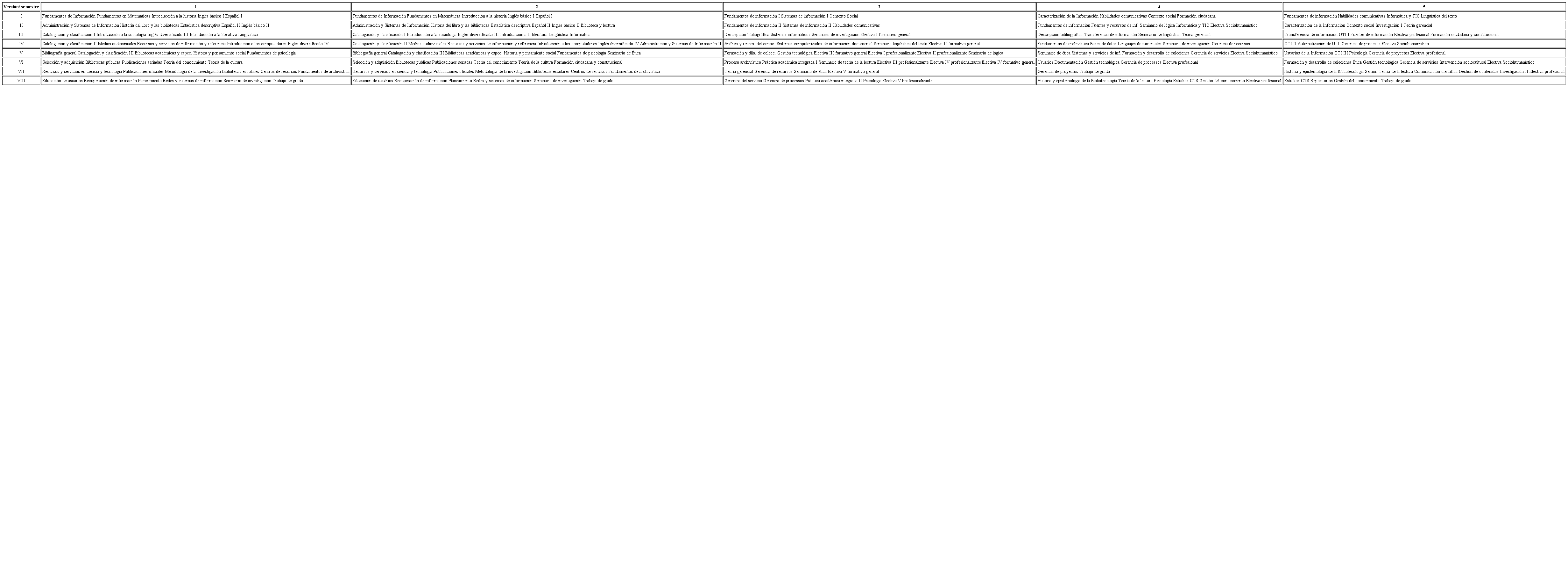 Como resultado del trabajo del Comité de Currículo se presenta a discusión pública en la VII Reunión de Egresados de la EIB (1995) un nuevo plan curricular. Esta propuesta no es aprobada, debido a que no hay un consenso general para iniciar una total transformación curricular; no obstante, se logra una nueva reforma parcial en el plan de estudios para el primer semestre de 1996; reforma que introduce nuevas asignaturas (Biblioteca y Lectura, Computadores II, Administración II y Seminario de Ética), disminuye créditos a las asignaturas de Organización y tratamiento de la Información y acoge la directriz de la Universidad de suprimir los créditos a las asignaturas de Inglés I, II, III y IV; constituyéndose como versión curricular dos. (Jaramillo, Valencia de Veizaga, Rosero-Jimenez & Álvarez-Zapata, 2003, p. 3)