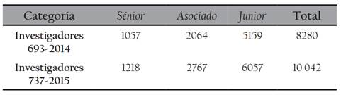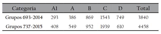 Todo este contexto puede ser resumido por la clasificación de los grupos (Tabla 1) y los investigadores (Tabla 2) en las distintas categorías de acuerdo a las últimas dos convocatorias. Cabe señalar que las variaciones se deben principalmente a la incorporación o no de varios grupos de investigación de las áreas de ciencias sociales, humanidades y artes según su aceptación o no al registro en la plataforma ScienTI y la participación en las convocatorias, pues ha sido esta área la más crítica al proceso.7