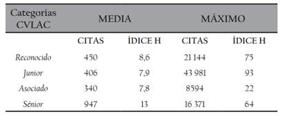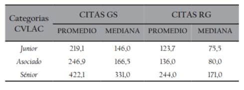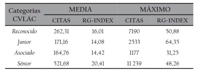 Al comparar la información de GS y RG con las cuatro categorías de CvLAC (Colciencias ScienTI) se observa que un porcentaje significativo de investigadores que aparecen clasificados como Reconocidos o Junior muestran una importante visibilidad web e impacto. De forma similar, otro alto porcentaje de los etiquetados como Sénior o Asociado presentan valores bajos en GS y RG incluso en casos donde su producción científica de acuerdo a CvLAC es muy alta.
