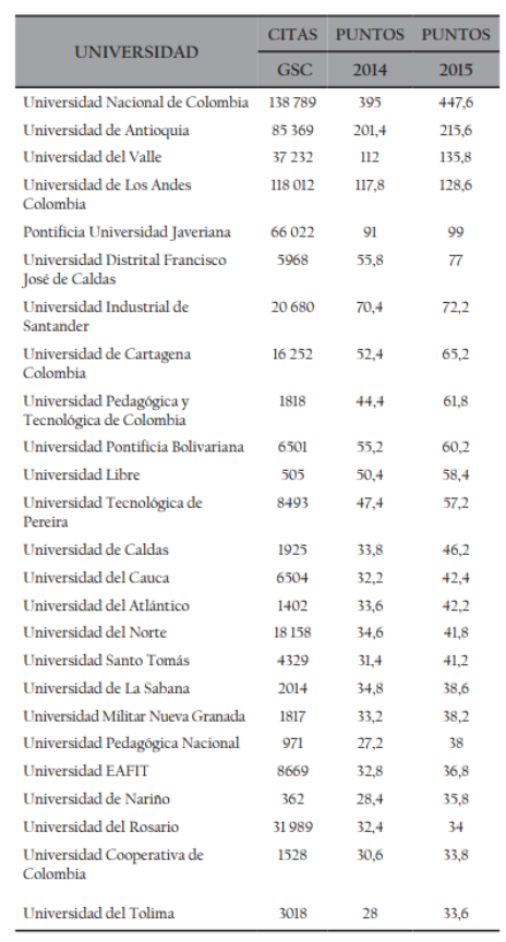 Por último, analizamos los datos de las instituciones más representativas, en este un grupo de universidades tanto públicas como privadas seleccionadas a partir de datos del Observatorio de la Universidad Colombiana (http://www.universidad.edu.co/). Con información de las dos últimas convocatorias de Colciencias el Observatorio desarrolló un sistema de puntaje que daba diferentes pesos a los grupos clasificados por Colciencias de acuerdo con dicha gradación. Para las 50 primeras universidades la correlación entre los datos de la última convocatoria (737-2015) y el número de citas obtenidas de GS es alta (R2=0,708, p<0,01). La Tabla 10 muestra los datos para las primeras 25 universidades.