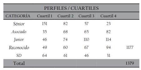 Las Tablas 3 y 4 exploran la población según su distribución por cuartiles (grupos iguales de la clasificación). Como era de esperar, el número de investigadores Sénior en el primer cuartil es mucho mayor que el resto de los grupos y mucho más bajo respecto al cuarto cuartil, solo el inverso que muestra la distribución de Juniors y Asociados. Un patrón similar surge cuando se considera el número de citas recibidas.