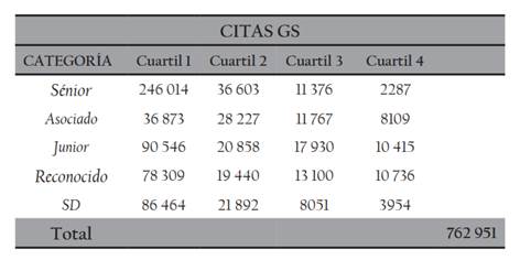 • Clasificación de la lista clasificada -por índice h, luego por número de citas- de investigadores en Citas de la GSC en cuatro cuartiles (La lista utilizada en este análisis es probablemente sesgada, ya que se compone principalmente de los autores más activos. Otra limitación está relacionada con la desambiguación de nombres, ya que los perfiles se crean sin un identificador estándar como ORCID. Debido a este problema, no ha sido posible identificar todos los perfiles en las bases de datos Colciencias y RG).