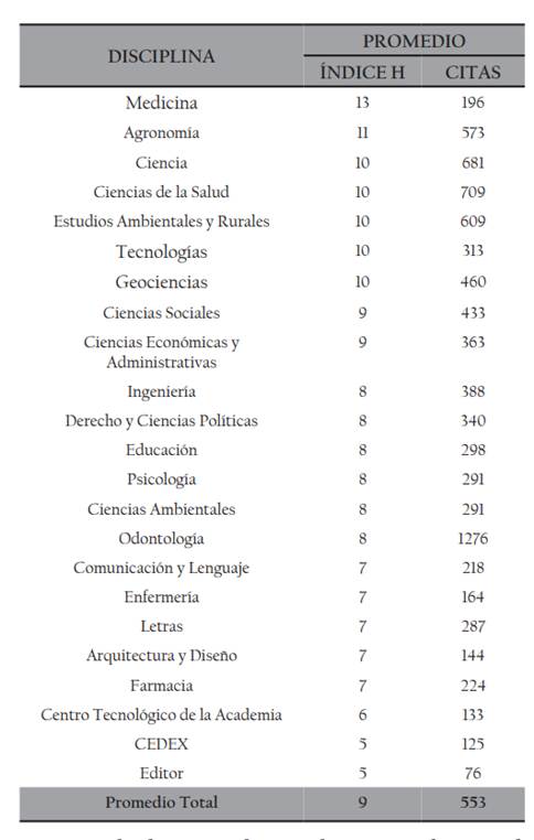 Una situación similar se observa en el caso de Colombia. Las dinámicas de disciplinas diversas son asimismo diferentes y ello se refleja en los patrones de autoría, coautoría o citación o predilección. Esto aparece claramente en los informes anuales del Observatorio Colombiano de ciencia y Tecnología (http://ocyt.org. co). Otros autores como Moya-Anegón (2016), en su informe sobre la producción científica colombiana entre 2003 y 2010 con datos Scopus, o Vélez-Cuartas, Gómez-Flórez, Úsuga-Ciro & Vélez-Trujillo (2014) también reconocen la citada diversidad disciplinar.